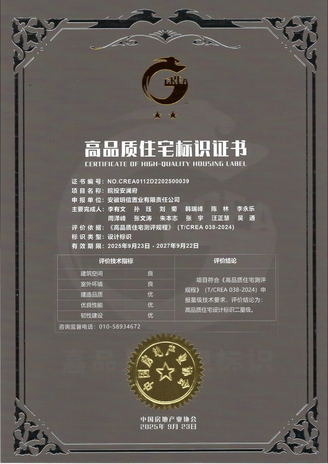 “高品質(zhì)住宅標識項目”由中國房地產(chǎn)業(yè)協(xié)會聯(lián)合專業(yè)機構(gòu)共同評定,從規(guī)劃設計、建筑空間、室外環(huán)境、建造品質(zhì)、優(yōu)良性能到住區(qū)管理進行多維度系統(tǒng)評估。皖投·安瀾府的成功獲評,標志著項目在綜合品質(zhì)方面獲得行業(yè)權(quán)威認可。